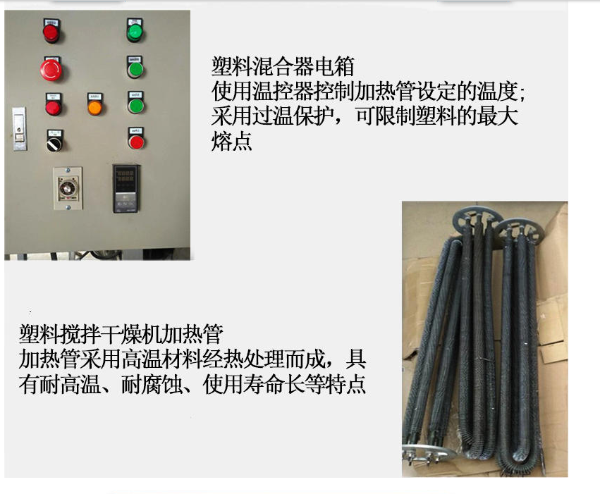 8、干燥混合功能二合一,但不需要干燥時(shí),只需將“加熱開(kāi)關(guān)”及“風(fēng)機(jī)開(kāi)關(guān)”關(guān)閉,本系列機(jī)型即可用于塑料攪拌均化用途,一機(jī)二用;